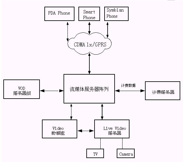根據(jù)中國(guó)2.5網(wǎng)絡(luò)的特點(diǎn),結(jié)合我們自身的技術(shù)和系統(tǒng)解決方案的優(yōu)勢(shì),我們針對(duì)CDMA1X網(wǎng)絡(luò)推出了移動(dòng)VOD,增強(qiáng)型移動(dòng)視頻郵件、移動(dòng)可視電話的系統(tǒng)解決方案。在GPRS網(wǎng)絡(luò)上則推出了移動(dòng)音頻點(diǎn)播業(yè)務(wù),移動(dòng)視頻郵件業(yè)務(wù)。下面我們對(duì)這些業(yè)務(wù)做具體描述。