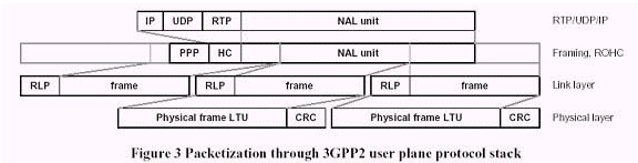 因為包交換服務(wù),3GPP/3GPP2同意了一個基于IP的協(xié)議棧。圖3展示了一個NAL單元通過3GPP2用戶平面協(xié)議堆棧被封裝在RTP/UDP/IP的典型過程。在頭壓縮(RoHC)后,此IP/UDP/RTP包被封裝進(jìn)一個PDCP/PPP2包,變成了頻率鏈路控制(RLC)和服務(wù)數(shù)據(jù)單元(SDU)。RLC協(xié)議可以在三種模式下工作:透明、非確認(rèn)和確認(rèn)模式。RLC協(xié)議為用戶和數(shù)據(jù)提供分段和重傳服務(wù)。在透明和非確認(rèn)模式,RLC被定義為單向的;在確認(rèn)模式,RLC被定義為雙向的。對於所有的RLC模式,循環(huán)冗余檢查(CRC)的錯誤檢測在物理層上被運(yùn)行,而且CRC檢查的結(jié)果和真實的數(shù)據(jù)一起被遞送到 RLC。在透明模式中,沒有上層的協(xié)議被增加到較高層的數(shù)據(jù)中。錯誤的協(xié)議數(shù)據(jù)單元(PDUs)可以被丟棄或標(biāo)記為錯誤。在非確認(rèn)模式中,沒有重傳協(xié)議在使用中,而且數(shù)據(jù)傳送沒有保證。接受到的錯誤數(shù)據(jù)根據(jù)配置來決定丟棄或標(biāo)記為錯誤。在確認(rèn)模式中,一種自動的重復(fù)請求機(jī)制被用于錯誤訂正。