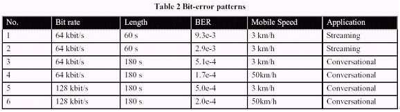 在H.264/AVC的標(biāo)準(zhǔn)化進(jìn)程中,移動視頻傳輸?shù)闹匾砸呀?jīng)在3G移動傳輸里面通過對基于H.324M的電路交換會話服務(wù)、包交換會話和流服務(wù)得到了證實。這些測試情況允許適當(dāng)?shù)木幋a特征、測試和容錯仿真等特征的選擇,同時也可以得到有意義的測試結(jié)果。在本文,我們將會把重心集中在基于IP的測試情況。在正常的測試情況下,我們會定義6個測試情形組合,主要測試通過3G移動網(wǎng)絡(luò)的包交換會話服務(wù)和包交換流媒體服務(wù)。另外,測試環(huán)境包括簡單的脫機(jī)3GPP/3GPP2仿真軟件、程序接口和評估標(biāo)準(zhǔn)。無線信道使用專門生產(chǎn)用于移動無線信道仿真的位率差錯模板來進(jìn)行仿真。 位率差錯模板在物理層上和RLC/RLP層下來捕獲,因此,它們在實驗被用于物理層仿真。通過位率差錯模板實驗中得出的碼率、長度、位錯誤率和移動速度數(shù)據(jù)詳見下表2。