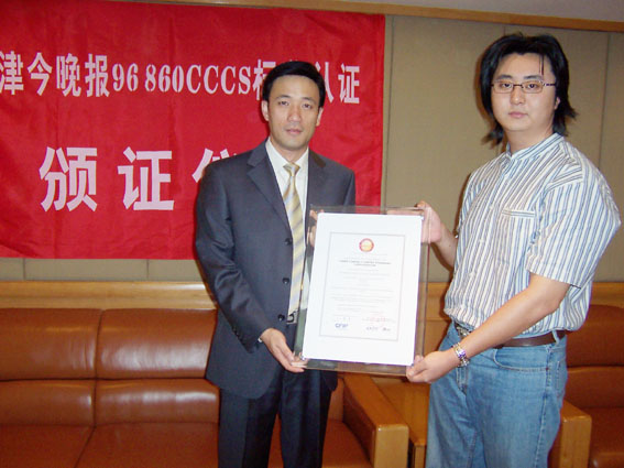 2004年9月9日,天津今晚報(bào)公眾服務(wù)中心通過(guò)了《全國(guó)呼叫中心運(yùn)營(yíng)績(jī)效標(biāo)準(zhǔn)》(CCCS-OP-2003)認(rèn)證,并獲得由中國(guó)信息化推進(jìn)聯(lián)盟客戶關(guān)系管理專業(yè)委員會(huì)頒發(fā)的認(rèn)證證書(四星級(jí)客戶服務(wù)中心),成為國(guó)內(nèi)傳媒業(yè)首家通過(guò)此認(rèn)證的呼叫中心。