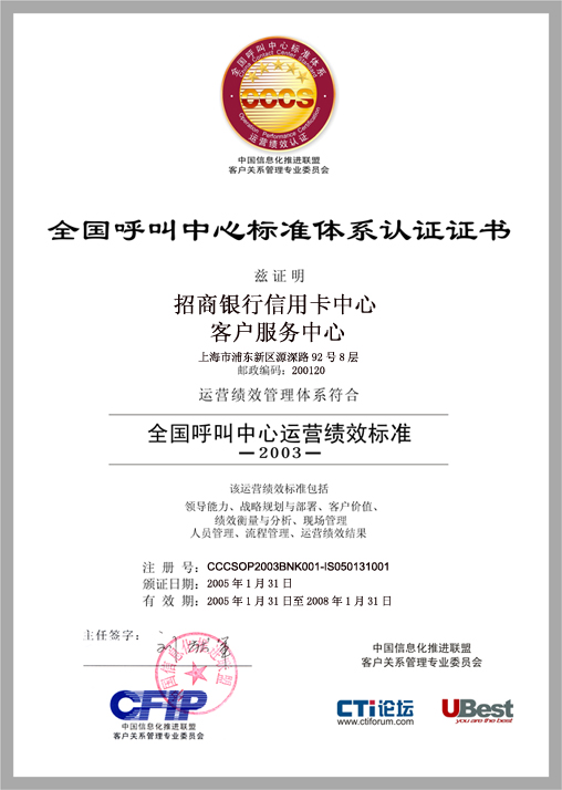 招商銀行信用卡中心客戶(hù)服務(wù)中心(800-820-5555)成立于2002年,是集電話服務(wù)熱線、傳真、電子郵件、短信服務(wù)以及互聯(lián)網(wǎng)等客戶(hù)溝通渠道于一體的多功能客戶(hù)服務(wù)中心,為所有招商銀行信用卡用戶(hù)提供365×24×7全年無(wú)休的優(yōu)質(zhì)客戶(hù)服務(wù),曾榮獲“2004中國(guó)最佳呼叫中心”稱(chēng)號(hào)。作為中國(guó)銀行業(yè)率先加入CCCS標(biāo)準(zhǔn)認(rèn)證體系的企業(yè),通過(guò)此次認(rèn)證,一方面使得招商銀行客戶(hù)服務(wù)中心的運(yùn)營(yíng)管理水平進(jìn)一步得到了提升和改善,實(shí)現(xiàn)規(guī)范化、精細(xì)化;另一方面,CCCS標(biāo)準(zhǔn)也從該公司在客戶(hù)服務(wù)和客戶(hù)關(guān)系管理方面所積累起來(lái)的寶貴實(shí)踐經(jīng)驗(yàn)中汲取了養(yǎng)分,使CCCS標(biāo)準(zhǔn)能夠不斷地完善和發(fā)展。