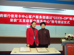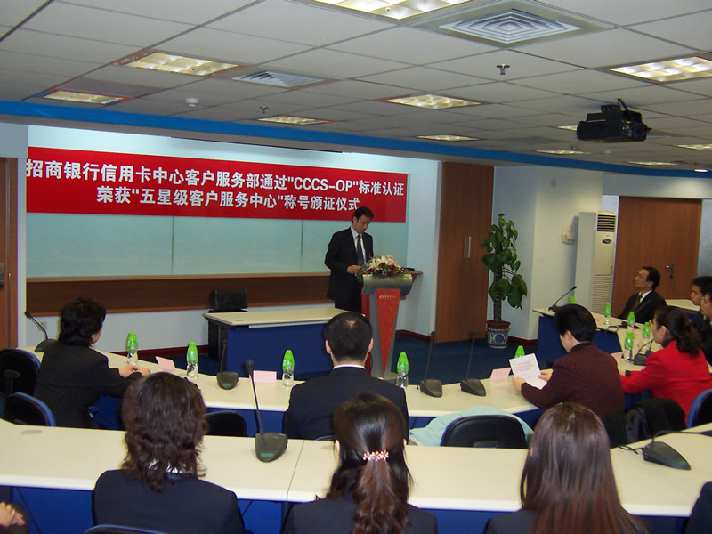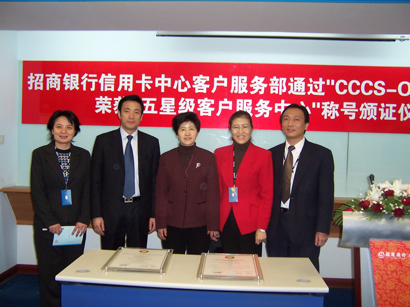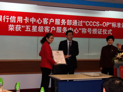 這天的上午10點(diǎn)30分,在招商銀行信用卡中心上海總部舉行了簡(jiǎn)約而隆重的頒證儀式,信用卡中心常務(wù)副總經(jīng)理梁瑤蘭從信息產(chǎn)業(yè)部電子信息中心副主任、中國(guó)信息化推進(jìn)聯(lián)盟秘書(shū)長(zhǎng)劉獻(xiàn)軍手中接過(guò)證書(shū),標(biāo)志著國(guó)內(nèi)第一家五星級(jí)客戶(hù)服務(wù)中心誕生了!