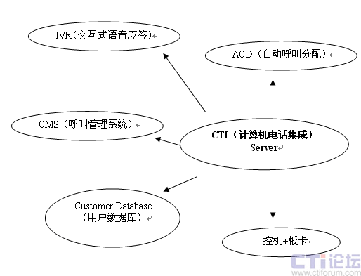 以CTI(計(jì)算機(jī)電話集成)為核心模塊,實(shí)現(xiàn)對IVR(交互式語音應(yīng)答)、ACD(自動(dòng)呼叫分配)、CMS(呼叫管理系統(tǒng))、板卡+工控機(jī)、Customer