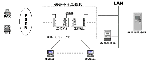 在一些小型CALL CENTER系統(tǒng)中,人們通常通過(guò)語(yǔ)音板卡加工控機(jī)的方式搭建系統(tǒng),通常一臺(tái)設(shè)備就集成了ACD、IVR、CTI等各種資源,各資源的使用、調(diào)派通過(guò)軟件進(jìn)行控制,有效的解決了建設(shè)成本高、系統(tǒng)構(gòu)造繁復(fù)的問(wèn)題,具有相當(dāng)?shù)撵`活性。然而由于工控機(jī)和語(yǔ)音板卡容量有限,同時(shí)其標(biāo)準(zhǔn)最多只能是工業(yè)級(jí)標(biāo)準(zhǔn),因此在構(gòu)建相對(duì)大型的呼叫中心時(shí)就總是捉襟見(jiàn)肘。為了增加系統(tǒng)容量,解決多臺(tái)PC之間進(jìn)行通道交換的難題,人們又設(shè)計(jì)了過(guò)機(jī)卡和過(guò)機(jī)線(xiàn)來(lái)解決,其應(yīng)用系統(tǒng)如下圖:
