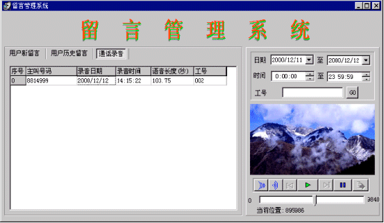 當(dāng)系統(tǒng)中無話務(wù)員登錄或等待超過20秒,則進(jìn)入語音信箱服務(wù)。語音信箱在進(jìn)入時(shí)提示用戶:“系統(tǒng)正忙,請(qǐng)留下您的聯(lián)系電話,復(fù)本機(jī)號(hào)請(qǐng)掛機(jī),復(fù)其他號(hào)碼請(qǐng)輸入電話號(hào)碼,按‘#’號(hào)鍵結(jié)束,或者在聽到‘嘟’的一聲之后留下你的留言”,當(dāng)主叫號(hào)碼位數(shù)不夠7位時(shí),提示:“系統(tǒng)正忙,請(qǐng)輸入您的聯(lián)系電話,按‘#’號(hào)鍵結(jié)束,或者在聽到‘嘟’的一聲之后留下你的留言”,系統(tǒng)將客戶留下的電話號(hào)碼記錄到數(shù)據(jù)庫(kù)中。將留言存放到一個(gè)指定目錄中,用話務(wù)號(hào)作為語音文件名。