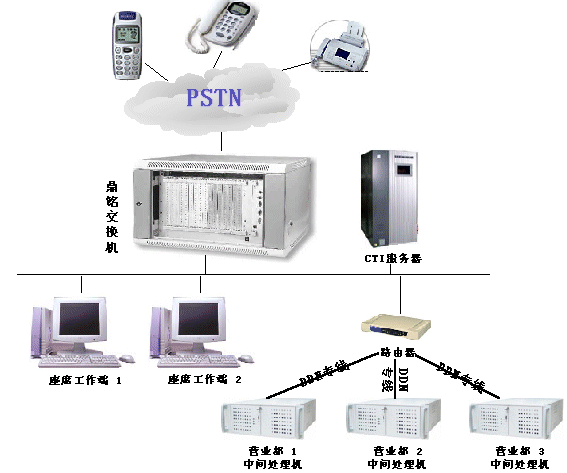 該系統(tǒng)由前端機(jī)鼎銘PBX、CTI服務(wù)器、中間處理機(jī)、座席客戶端組成(見(jiàn)附圖)。