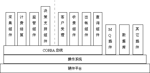 長話計費系統(tǒng)既包括計費結算系統(tǒng),又包括營業(yè)服務系統(tǒng),功能比較多,數(shù)據(jù)處理流程也相對復雜。 簡單的傳統(tǒng)數(shù)據(jù)庫的機械化編程已很難滿足系統(tǒng)對大數(shù)據(jù)量的處理及靈活性等方面的要求,因此在這套系統(tǒng)中,我們采用了一些當今業(yè)界的熱門技術。比如采用了CORBA軟總線思想和MQ Series消息管理隊列,也使之成為聯(lián)機計費系統(tǒng)平臺的一次成功實施。其系統(tǒng)層次結構圖如下: