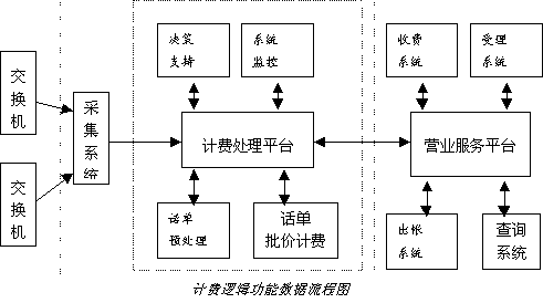 從邏輯功能上分,它經(jīng)常被分為三部分:采集系統(tǒng)、計費處理系統(tǒng)、營業(yè)服務系統(tǒng)。其具體數(shù)據(jù)流程如下圖所示: