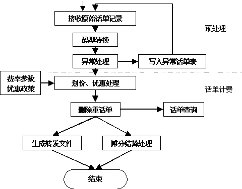 區(qū)域計費中心從交換機實時/定時采集原始話單數(shù)據(jù),它是整個系統(tǒng)的起始點,也是系統(tǒng)其它部分的基礎。其性能直接影響整個系統(tǒng)的運行效果。對該模塊要求穩(wěn)定可靠、處理靈活。 “八國九制”意味著,一個好的計費采集系統(tǒng),必然要求它能夠處理多種交換機格式。比如EWSD、S1240、5ESS等等。 在采集所用網(wǎng)絡傳輸協(xié)議上,一般要求系統(tǒng)支持X.25/FTAM、X.25/CMIP等協(xié)議。 2.計費結算 采集機從交換機上采集下來原始話單文件,該類文件是BCD碼文件,需要進行碼型轉換,變成ASCII碼文件,為后續(xù)的計費處理創(chuàng)造條件。 話單格式轉換:話單格式轉換從交換機下載的二進制信息中提取用于計費和統(tǒng)計的信息,并從二進制格式轉換為文本格式。但是由于上面提到的原因,國內(nèi)交換機種類比較多,各種交換機的數(shù)據(jù)格式都不相同,即使是相同的交換機,由于需要版本升級,也會對數(shù)據(jù)格式產(chǎn)生影響。假如預處理模塊不能靈活地處理各種格式的文件,則勢必會對電信服務商的投資造成浪費。國創(chuàng)公司在話單預處理中,提供了一種“自定義話單格式”方式,用戶可以根據(jù)自己交換機的數(shù)據(jù)格式進行配置,而預處理模塊不需進行修改。即可以適應當前多種交換機并存的局面,又可以適應未來交換機版本升級的需求,極大地保護了用戶的投資。 計費劃價處理: 計費計算模塊根據(jù)話單中記錄的起始時間、通話時長、對端號碼等信息在資費策略庫中查找滿足條件的費率極其優(yōu)惠策略。從而計算出此次通話應向用戶收取的基本費用。特別地,考慮到業(yè)務的發(fā)展與變化,系統(tǒng)可對費用中的各項子費用單獨計算,并能夠適應新的優(yōu)惠策略的增加。整個計費流程如下: