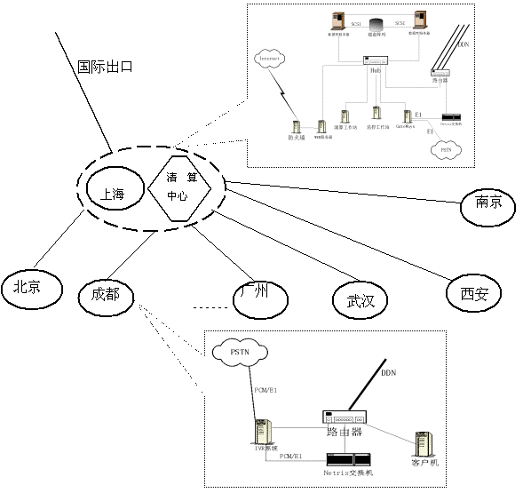 數據網絡為DDN專線構成的Intranet,該Intranet在國內可以有一個以上的國際出口。并通過防火墻同Internet連接。語音/數據的傳輸采用網絡交換設備。