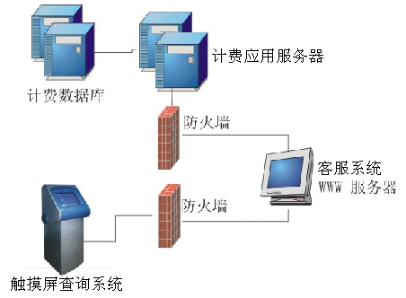 。。觸摸屏查詢系統(tǒng)通過WWW方式訪問鐵通客服系統(tǒng)的WEB服務(wù)器,再由WEB服務(wù)器訪問計費系統(tǒng)的應(yīng)用服務(wù)器,由應(yīng)用服務(wù)器上的代理訪問計費系統(tǒng)的數(shù)據(jù)庫。由于觸摸屏查詢系統(tǒng)與客服系統(tǒng)WEB服務(wù)器之間、客服系統(tǒng)WEB服務(wù)器與計費應(yīng)用服務(wù)器每層都有網(wǎng)絡(luò)防火墻進行隔離,同時客服系統(tǒng)的WEB服務(wù)器并不直接訪問計費數(shù)據(jù)庫,因此可以保證計費系統(tǒng)的數(shù)據(jù)安全。在觸摸屏上用戶除了訪問系統(tǒng)提供的功能以外,不能做任何操作,再次保證了系統(tǒng)的安全可靠。