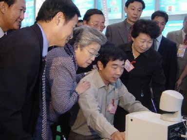 C&E 2.2、嵌入式產品InterSound 3.0和Talking Book電子書等。語音合成給觀眾帶來了全新的感受,流暢自然的語音合成、抑揚頓挫的唐詩誦讀吸引了無數(shù)參觀者駐足、觀賞。國務院副總理吳儀同志參觀安徽展區(qū)時,親臨訊飛展區(qū),對訊飛的語音技術表現(xiàn)出強烈興趣?拼笥嶏w陳燕總監(jiān)向吳儀副總理簡要匯報了中文語音產業(yè)及科大訊飛公司的發(fā)展情況,并親自演示了訊飛電信級和芯片級語音產品。吳儀臉上不時露出微笑,鼓勵訊飛再接再厲,把民族語音產業(yè)做大做強。