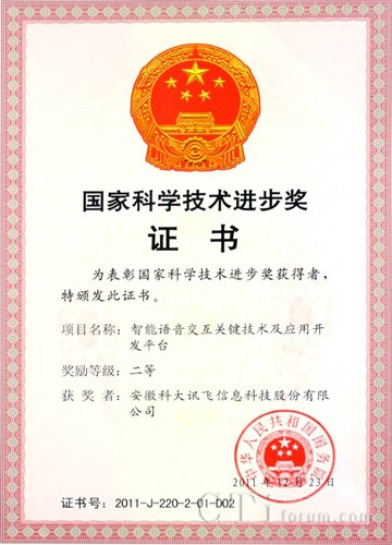 CTI論壇(ctiforum)2月20日消息(記者 浩宇):2月14日,2011年度國(guó)家科學(xué)技術(shù)獎(jiǎng)勵(lì)大會(huì)在北京隆重舉行,黨和國(guó)家領(lǐng)導(dǎo)人胡錦濤、溫家寶、李長(zhǎng)春、李克強(qiáng)出席大會(huì)并為獲獎(jiǎng)代表頒獎(jiǎng)。由科大訊飛和中國(guó)科學(xué)技術(shù)大學(xué)聯(lián)合提交的“智能語(yǔ)音交互關(guān)鍵技術(shù)及應(yīng)用開(kāi)發(fā)平臺(tái)”項(xiàng)目榮獲國(guó)家科技進(jìn)步二等獎(jiǎng),在本年度信息化領(lǐng)域(計(jì)算機(jī)與自動(dòng)控制、通信、現(xiàn)代服務(wù)業(yè)信息化等專(zhuān)業(yè)組)一等獎(jiǎng)空缺的情況下,該項(xiàng)目在計(jì)算機(jī)與自動(dòng)控制專(zhuān)業(yè)組所有項(xiàng)目中排名第一。這是科大訊飛第二次獲得這一國(guó)家獎(jiǎng)重大榮譽(yù),也是語(yǔ)音產(chǎn)業(yè)界唯一獲此殊榮的企業(yè)。