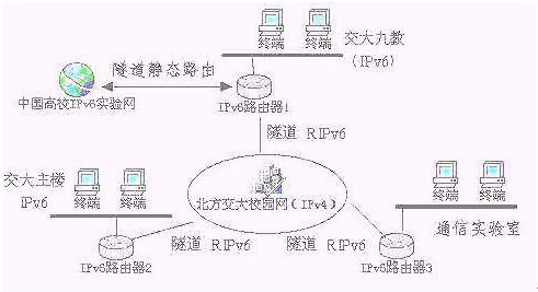 FH6501(IPv6路由器)已經(jīng)在北方交通大學(xué)學(xué)生IPv6實(shí)驗(yàn)床實(shí)際安全運(yùn)行了六個月。北方交通大學(xué)學(xué)生IPv6實(shí)驗(yàn)床采用我公司IPv6路由器產(chǎn)品,架構(gòu)了三個主節(jié)點(diǎn),借助隧道連接到由Nokia資助建設(shè)的中國高校IPv6實(shí)驗(yàn)床。目前三個主節(jié)點(diǎn)之間的連接是借助于學(xué)校原有的IPv4網(wǎng)絡(luò),通過隧道技術(shù)實(shí)現(xiàn)節(jié)點(diǎn)間的通信(見圖示)。