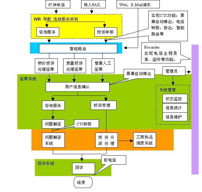 12315消費(fèi)者投訴受理系統(tǒng)提供的業(yè)務(wù)功能包括兩方面:一是直接面向消費(fèi)者的服務(wù)功能,這類功能包括消費(fèi)者投訴舉報(bào)服務(wù)、消費(fèi)者電話咨詢服務(wù)、投訴舉報(bào)結(jié)果查詢服務(wù)以及因特網(wǎng)服務(wù);二是面向系統(tǒng)本身的功能,這類功能包括投訴舉報(bào)執(zhí)法調(diào)度、系統(tǒng)數(shù)據(jù)維護(hù)、業(yè)務(wù)統(tǒng)計(jì)分析及報(bào)表等。