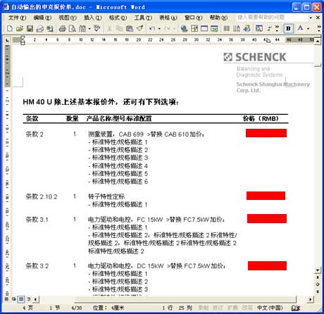以上海申克的報價單為例。與其說它是一份報價單,不如說它是一套幾十頁的客戶化復雜方案書,它由各方面數(shù)據(jù)和文檔自動合并、輸出為一份Word文件: