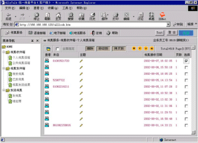 3、 Internet檢索:用戶用Web瀏覽器通過(guò)Internet實(shí)現(xiàn)播放、刪除、傳送、轉(zhuǎn)發(fā)、存取各自的語(yǔ)音郵件消息。