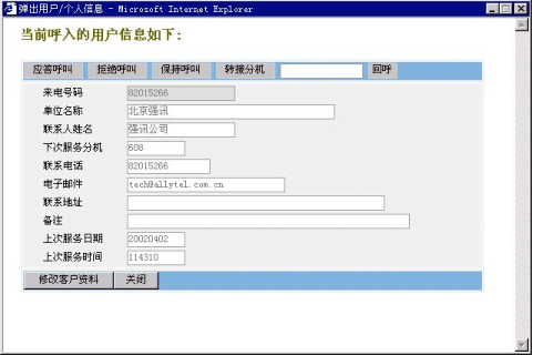 4、來(lái)電顯示:當(dāng)有外線電話撥入坐席,坐席電話振鈴的同時(shí),會(huì)在顯示器上彈出新窗口顯示來(lái)電用戶的信息;