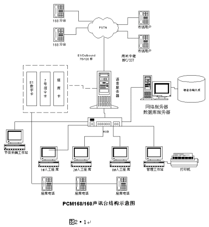 系統(tǒng)主要由計算機(jī)網(wǎng)絡(luò)、數(shù)字中繼接口、人工座席、語音處理及存儲、系統(tǒng)管理(數(shù)據(jù)庫管理+計費管理+語音編輯)幾部分組成。如圖2·1所示: