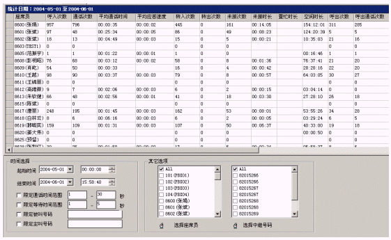 呼叫統(tǒng)計(jì)是呼叫中心最重要的功能。該呼叫中心系統(tǒng)設(shè)計(jì)了一整套豐富的呼叫統(tǒng)計(jì)管理工具,能有效地實(shí)現(xiàn)對(duì)業(yè)務(wù)、設(shè)備、人員的全面管理,使呼叫中心隨著運(yùn)營(yíng)的過程效益不斷地提高。同時(shí)提供實(shí)時(shí)的監(jiān)控工具,使管理人員及時(shí)了解整個(gè)系統(tǒng)的運(yùn)行狀態(tài)。