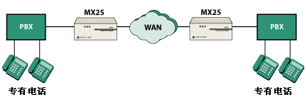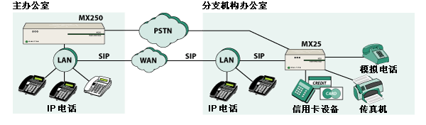 MX25 是一種能夠在兩種不同模式下工作的模塊化設(shè)備。在其中一種工作模式下,MX25 是一個通向 PSTN 網(wǎng)關(guān)的獨立 SIP。當在這種模式下工作時,MX25 轉(zhuǎn)換電話呼叫的格式,使其可以在 IP 網(wǎng)絡(luò)與公用電話網(wǎng)絡(luò)之間傳遞。另一種工作模式是,將 MX25 作為 MX250 的功能延伸系統(tǒng),用于不超過 25 個用戶的分支辦公室。在這種配置下,MX25 與 MX250 通信并交換有關(guān)用戶和設(shè)備的信息。即使連接 MX250 和 MX25 的 WAN 鏈路出現(xiàn)故障,MX25 也能繼續(xù)工作并處理來自/發(fā)往 PSTN 的傳入/傳出呼叫。