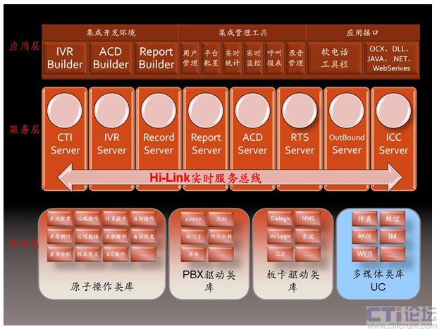 在擁有第五代呼叫中心Hi-Link核心軟件的商路通公司看來,呼叫中心軟件架構(gòu)包含三層,基礎(chǔ)層、服務(wù)層和應用層。而統(tǒng)一通信UC應從劃入基礎(chǔ)層及服務(wù)層之中,PBX驅(qū)動類庫和板卡驅(qū)動類庫處理電話媒體的請求,而多媒體類庫用于處理其他統(tǒng)一通信的媒體,如傳真、短信、電子郵件、均包含在多媒體類庫之中。傳真、短信、電子郵件等請求分別由FAX
