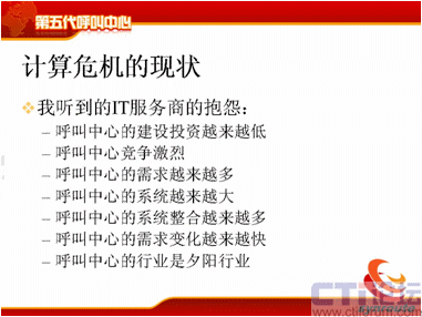 我們聽到IT服務(wù)商的抱怨可就更多了,說呼叫中心建設(shè)投資越來越低了,我在十年前建設(shè)一個20個座席的呼叫中心,能掙1500萬;可是現(xiàn)在20個座席的呼叫中心,10萬塊錢就把我打發(fā)了。呼叫中心競爭越來越激烈,投一個標(biāo),雖然一個呼叫中心只有100萬,這時候來的廠家有50家,相互壓價,相互壓價,這時候利潤都沒有了,F(xiàn)在的需求是越來越多了,體現(xiàn)在各個環(huán)節(jié),運營管理和業(yè)務(wù)模式上需求越來越多,最終客戶的要求也是越來越多,系統(tǒng)越來越大了,服務(wù)器也一大堆,以前一兩個服務(wù)器就夠了,現(xiàn)在需要4、5個,7、8個,這些服務(wù)器還需要相互進(jìn)行聯(lián)絡(luò)整合,系統(tǒng)的整合越來越多,比如要和ERP整合,要和CRM整合,要和供應(yīng)鏈整合,系統(tǒng)的整合越來越多,而且需求變化越來越大,呼叫中心需求的變化產(chǎn)生于很多方面,后面我會仔細(xì)介紹。呼叫中心的行業(yè)變成一個夕陽行業(yè)了,這是現(xiàn)在做IT服務(wù)商普遍在提的想法。