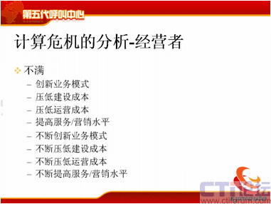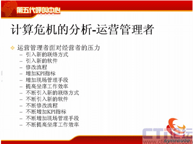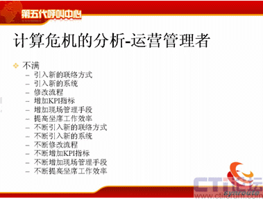 計算危機的下一方面是運營管理者,可能在座很多人是做運營管理的,你們會不斷去跟IT服務(wù)者提需求,我下一個月想引進(jìn)新的聯(lián)絡(luò)方式,下個月我想引進(jìn)新的軟件,引進(jìn)新的流程,我想增加KPI指標(biāo),我想增加現(xiàn)場的管理手段,我想提高座席的工作效率,后面也是不斷的,不斷地去引入新的聯(lián)絡(luò)方式。