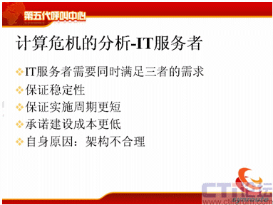 我分析一下計算的危機,計算危機來源于三個方面,第一是客戶面對不斷提升的服務(wù)水平,現(xiàn)在需要新的通信方式,包括電話、傳真、短信、電子郵件等等,還包括網(wǎng)上的護(hù)航瀏覽,表單共享,電子排版等等通信方式。第二方面需要更快的服務(wù)時間,80%的電話是20秒接起,可是短信的響應(yīng)時間為什么這么長,需要更準(zhǔn)確的服務(wù),電話的服務(wù)是什么樣的,我現(xiàn)在需要網(wǎng)上交談的服務(wù)質(zhì)量也能夠得到保障等等,這是客戶對IT服務(wù)者提供的壓力。