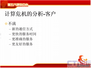 現(xiàn)在我們就分析一下后果,這時候計算危機的分析對于客戶來說,新的通訊方式我們都需要,可是呼叫中心沒有公布,我無法使用,更快的服務(wù)時間,大家看到了,比如說Web Chat,目前我點擊了80%是直接進(jìn)入留言的頁面,也就是說這時候沒有人工來服務(wù)了,或者是等待時間非常非常長,一個小時以后告訴我,排隊已經(jīng)到了,已經(jīng)沒有人能為我服務(wù)的,服務(wù)時間是根本沒有辦法保證的。第三個方面我們要更準(zhǔn)確的服務(wù),電話打進(jìn)去以后告訴我的信息和網(wǎng)絡(luò)告訴我的信息是完全不一樣的呢?為什么呢?因為它的知識庫沒有關(guān)聯(lián)起來,業(yè)務(wù)流程沒有關(guān)聯(lián)起來,這種更友好的服務(wù),考核的指標(biāo)都是一樣的。
