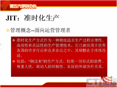 這四個特性是相輔相成的,首先在獨立方面,每一部分都有自己的特點,適應(yīng)自己企業(yè)發(fā)展的需要,同時也是相互制約的。首先我說這個獨立意識,對于呼叫中心來說,從經(jīng)營者的角度上,為什么要提TSP的概念呢?我們經(jīng)常遇到一個企業(yè)建立呼叫中心,是一個客戶服務(wù)中心,我們現(xiàn)在要做電話營銷了,那好吧,我們就建一套電話營銷系統(tǒng);這時候我們要做網(wǎng)絡(luò)方面的營銷,好了,我們再做一個網(wǎng)絡(luò)營銷的呼叫中心,這是經(jīng)營者現(xiàn)在意識亟待需要提高的。對于運營管理者來說,JIT思想,我剛才說過它是一個核心的,它是一個不斷需要改進(jìn)流程的,改進(jìn)去優(yōu)化的,提出各種KPI指標(biāo)去優(yōu)化的,那么這個過程也是現(xiàn)在目前運營管理者一直比較薄弱的,需要一直提高的部分。