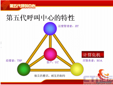 從分代上來講,和何總說的稍微有點差異,但是基本上一樣的,第一代是人工熱線的電話系統(tǒng),時間點也差不多;第二代是有了座席IVR、自動語音應(yīng)答這個特點;第三代是有了CTI、ACD企業(yè)級的呼叫中心;第四代是互聯(lián)網(wǎng),有VOIP、多媒體等等這些多媒體的呼叫中心。那么第五代是什么?第五代的典型特征是融合共享,它是有四個特性,UC、SOA、JIT和TSP,這是五代的幾個主要特點。