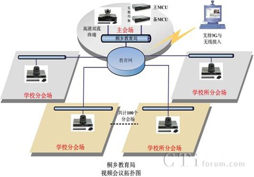作為浙江省的教育強(qiáng)市,桐鄉(xiāng)市教育局下屬有各級各類學(xué)校近百所,隨著學(xué)校規(guī)模的日益擴(kuò)大,以及教育信息化進(jìn)程的推進(jìn),桐鄉(xiāng)教育局需要構(gòu)建遠(yuǎn)程教學(xué)交流平臺,以實現(xiàn)資源共享。項目要求構(gòu)建的遠(yuǎn)程教學(xué)交流平臺能夠使教育局與各學(xué)校之間實現(xiàn)點對點、一點對多點、和多點群組視頻會議、遠(yuǎn)程課堂、課堂觀摩、互通教學(xué)等多種應(yīng)用。并且滿足以下需求: