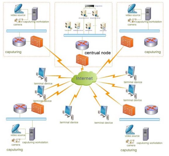 所有的部門(mén)的直播系統(tǒng)主要是進(jìn)行部隊(duì)演習(xí)、會(huì)議等現(xiàn)場(chǎng)的直播,直播信號(hào)通過(guò)WebLIVE視頻直播采集系統(tǒng)編碼壓縮,通過(guò)局域網(wǎng)上傳到中心機(jī)房,實(shí)時(shí)發(fā)布。采集同時(shí),將直播的數(shù)字信號(hào)存儲(chǔ)為AVI文件,上傳到放置在視頻點(diǎn)播服務(wù)器內(nèi),供其它地區(qū)的部隊(duì)指戰(zhàn)員進(jìn)行點(diǎn)播。