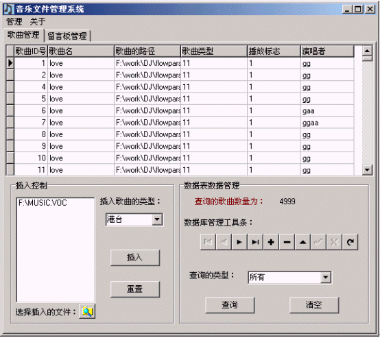 本軟件專門設(shè)計(jì)用來管理彩話系統(tǒng)中的音樂文件。可用該軟件進(jìn)行歌曲的管理,包括插入,查詢,修改,刪除等操作。
