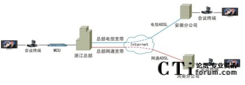 該套視頻會(huì)議系統(tǒng)最大的特點(diǎn)就是擁有超強(qiáng)的網(wǎng)絡(luò)適應(yīng)性。由于采用了高效視音頻編碼技術(shù)和大量智能化網(wǎng)絡(luò)適應(yīng)技術(shù),無論是ADSL、光纖還是VPN,均可進(jìn)行快速接入,并充分保證在Internet環(huán)境下的會(huì)議效果。因此,天元置業(yè)此次視頻會(huì)議系統(tǒng)就是完全基于公司現(xiàn)有的Internet進(jìn)行部署的。如圖1。