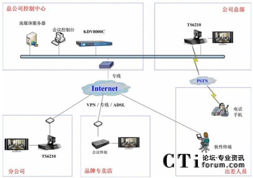科達TrueSens視頻會議系統(tǒng)最大的特點就是擁有超強的網(wǎng)絡適應性。由于采用了高效視音頻編碼技術(shù)和大量智能化網(wǎng)絡適應技術(shù),無論是ADSL、光纖還是VPN,均可進行快速接入,并充分保證在Internet環(huán)境下的會議效果。勁霸此次視頻會議系統(tǒng)就是基于Internet進行部署的。如圖1。