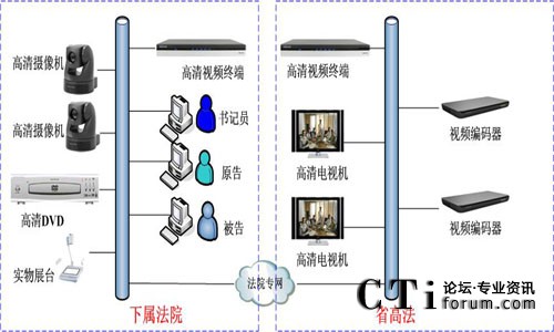 系統(tǒng)覆蓋省高院法庭、8個地市中院法庭和58個基層法庭。系統(tǒng)利用法院專用IP傳輸網(wǎng)絡(luò),以省高院各法庭為一級中心,地市中院為分控中心,基層法院為末端接入。在省高院中心、地市中院和基層分院設(shè)立遠程數(shù)字庭審中心,配置庭審視頻終端、專用攝像機和麥克風(fēng),實現(xiàn)圖像傳輸和遠程通信。