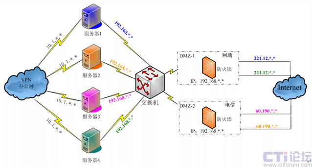 系統(tǒng)平臺采用集群化部署,實現(xiàn)跨網絡分布式,從而在應用中實現(xiàn)南北網通電信的互聯(lián)互通,以及專網用戶的無障礙接入,實現(xiàn)方式如下圖所示: