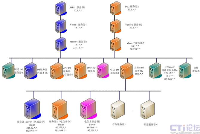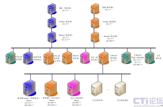 系統(tǒng)基礎平臺的部署采用4臺物理服務器方式實現(xiàn),四臺物理服務器分別有多塊網卡,為不同網絡用戶提供不同服務,同時實現(xiàn)實現(xiàn)核心數(shù)據(jù)的冗余、備份。在二級機構,即在省級每個省部署一臺分服務器,實現(xiàn)當?shù)赜脩舻臄?shù)據(jù)轉發(fā)等任務,系統(tǒng)部署入下圖所示: