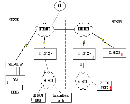 - A點(diǎn)是深圳福田的office,B點(diǎn)是深圳蛇口的辦事處,C點(diǎn)是香港總部的office,D點(diǎn)香港本地電話用戶,E點(diǎn)來自國際的呼叫,F(xiàn)點(diǎn)是深圳本地的電話用戶。
