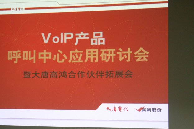 2006年9月8日,由中國VoIP業(yè)界的引領者大唐高鴻數(shù)據(jù)網(wǎng)絡技術股份有限公司(股票簡稱:高鴻股份;股票代碼:000851)主辦的大唐高鴻VoIP產(chǎn)品呼叫中心應用研討會在北京大唐電信集團主樓隆重舉行,此次會議由CTI論壇協(xié)辦。這是會議是大唐高鴻攜其VoIP產(chǎn)品進軍呼叫中心領域的里程碑。參加會議的代表來自虛擬運營商、VoIP公司、呼叫中心公司,企業(yè)行業(yè)客戶以及知名媒體共120余人,大唐高鴻還向會議代表介紹了其VoIP產(chǎn)品與呼叫中心廠商的合作計劃,預示著大唐高鴻正式向全國展開VoIP產(chǎn)品在呼叫中心行業(yè)中的應用的市場攻勢。