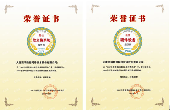 日前,由C114中國通信網(wǎng)主辦的“2007年度優(yōu)秀IP通信企業(yè)評選活動”圓滿結(jié)束。大唐高鴻數(shù)據(jù)網(wǎng)絡(luò)技術(shù)股份有限公司(以下簡稱“大唐高鴻”)憑借雄厚實(shí)力喜獲“2007年度中國IP通信行業(yè)最佳軟交換系統(tǒng)提供商”和“2007年度中國IP通信行業(yè)最佳硬件設(shè)備提供商”兩項(xiàng)大獎。這是大唐高鴻繼2007年4月榮獲中國VoIP論壇“2006年最佳中繼網(wǎng)關(guān)提供商”和“2006最佳VoIP解決方案提供商”兩項(xiàng)大獎之后的又一次實(shí)至名歸。