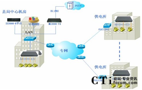 10個(gè)供電所部署MG3000-R32接入網(wǎng)關(guān),每個(gè)供電所提供1臺(tái)設(shè)備,支持32部電話(huà)接入。