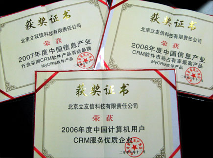 2007年1月16日,中國計算機(jī)用戶協(xié)會在京召開隆重而盛大的年度頒獎儀式。MyCRM在本次會上榮獲殊榮,一舉囊括了“2006年度中國信息產(chǎn)業(yè)CRM 軟件市場占有率最高產(chǎn)品”,“ 2006年度中國計算機(jī)用戶CRM服務(wù)優(yōu)質(zhì)企業(yè)”和“2007 年度中國信息產(chǎn)業(yè)行業(yè)采購CRM軟件產(chǎn)品首選品牌”。本次獲獎充分體現(xiàn)了MyCRM在CRM市場的全面領(lǐng)先優(yōu)勢。