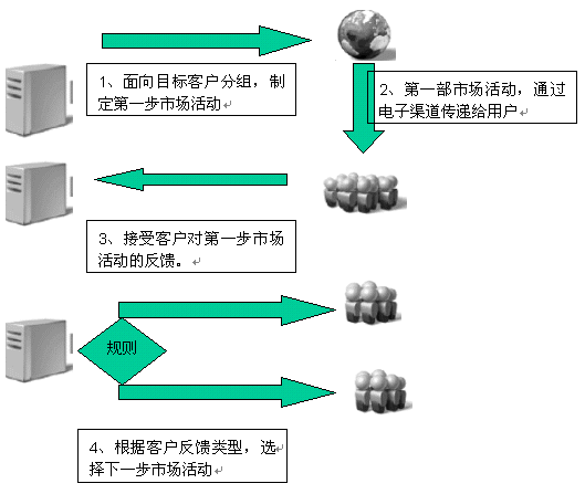電子化營(yíng)銷過程,是通常是多步驟市場(chǎng)活動(dòng)。每個(gè)步驟完成一定的工作,下一步的市場(chǎng)活動(dòng)將根據(jù)客戶對(duì)市場(chǎng)活動(dòng)的反饋和內(nèi)置的市場(chǎng)活動(dòng)的規(guī)則進(jìn)行選擇。而且每個(gè)步驟客戶市場(chǎng)活動(dòng)的反饋,都由電子化營(yíng)銷系統(tǒng)中的反饋處理系統(tǒng)集中到CRM系統(tǒng)中。從而為市場(chǎng)活動(dòng)效果評(píng)估,提供數(shù)據(jù)上的支持。