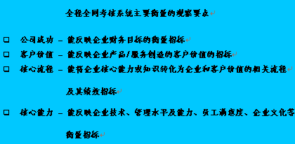 根據(jù)公司制定的策略目標,將平衡記分卡體系引入客戶服務(wù)的全程全網(wǎng)考核系統(tǒng)當(dāng)中,這一體系能比較全面和客觀地反映客戶關(guān)系中心的運營績效。完成整個全程全網(wǎng)考核系統(tǒng)設(shè)計的關(guān)鍵的成功因素為: