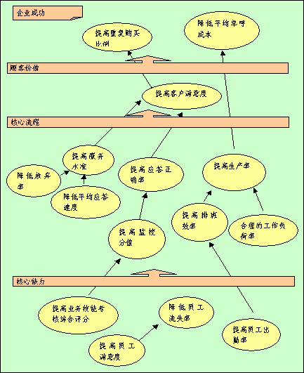 全程全網(wǎng)考核策略目標因果關(guān)系圖是"平衡計分卡"應(yīng)用的重要環(huán)節(jié),在此要特別強調(diào)?因為它是將根據(jù)公司遠景規(guī)劃以及使命確定的四個考核維度轉(zhuǎn)化為全程全網(wǎng)考核系統(tǒng)進入實際操作階段之關(guān)鍵步驟。在平衡記分卡的設(shè)計過程中,它起著承前啟后的作用,在構(gòu)建呼叫中心全程全網(wǎng)考核系統(tǒng)中全程全網(wǎng)考核策略目標因果關(guān)系圖的突破性銜接功能-以其邏輯性的架構(gòu)來界定和描述實現(xiàn)全面績效考核的策略方案。將公司成功、客戶價值、核心流程和呼叫中心核心能力之間的關(guān)聯(lián)清晰地呈現(xiàn),并將企業(yè)的策略與其績效衡量系統(tǒng)相銜接。