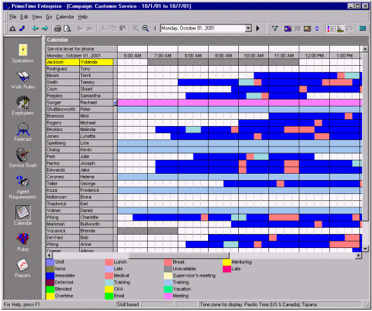 絕大多數(shù)的WFMS可以通過(guò)歷史數(shù)據(jù)和人員情況自動(dòng)生成排班表。而且它也只是簡(jiǎn)單的根據(jù)呼叫中心的運(yùn)營(yíng)時(shí)間來(lái)排班。舉個(gè)例子,某個(gè)呼叫中心在排班是有兩個(gè)班,一個(gè)工作時(shí)間是早7點(diǎn)到下午3點(diǎn),另一個(gè)是早九點(diǎn)到晚五點(diǎn),這就意味著不僅要安排早、晚休息,還要顧及到午休的時(shí)間。休息的安排要保證能夠在電話(huà)的持續(xù)中也能有持續(xù)的人員保證電話(huà)量。在這個(gè)自動(dòng)化軟件的之中還有一個(gè)因素要能夠?qū)崿F(xiàn)自動(dòng)化--人的因素。例如:Mary和Jane想同時(shí)去吃午餐,然而自動(dòng)化的排班表并不是這樣的。然而主管根據(jù)當(dāng)時(shí)的話(huà)務(wù)量情況和工作狀況以及工作規(guī)范批準(zhǔn)了Mary和Jane共享午餐的要求,而WFMS就要能夠處理這樣很有可能發(fā)生,而且是合理的情況。排班表的更改應(yīng)該就是簡(jiǎn)單的拖拽圖標(biāo)就應(yīng)該能夠?qū)崿F(xiàn)的功能,并且能夠在這種更改會(huì)對(duì)預(yù)測(cè)的話(huà)務(wù)量差生不好影響時(shí),拒絕這種拖拽行為。