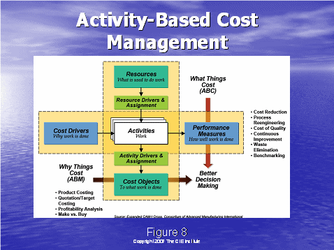 通過了解圖8,我們將以行動成本管理大體是什么的總括作為結束。我們從左邊的成本驅動因素開始——這是做工作的原因,例如:獲得客戶,維持客戶。就如圖4中所說的,這些成本驅動因素可以細分到工作行動上去?梢酝ㄟ^描述人,培訓,設備和技術資源來組成工作行動。資源驅動因素被用于分配這些企業(yè)成本到各個行動上去。下一步就是系統(tǒng)地確定行動驅動因素,分配行動成本到成本對象上去,這有利于決策的制定。例如,獲得一個客戶和維持一個客戶需要花費多少的成本?